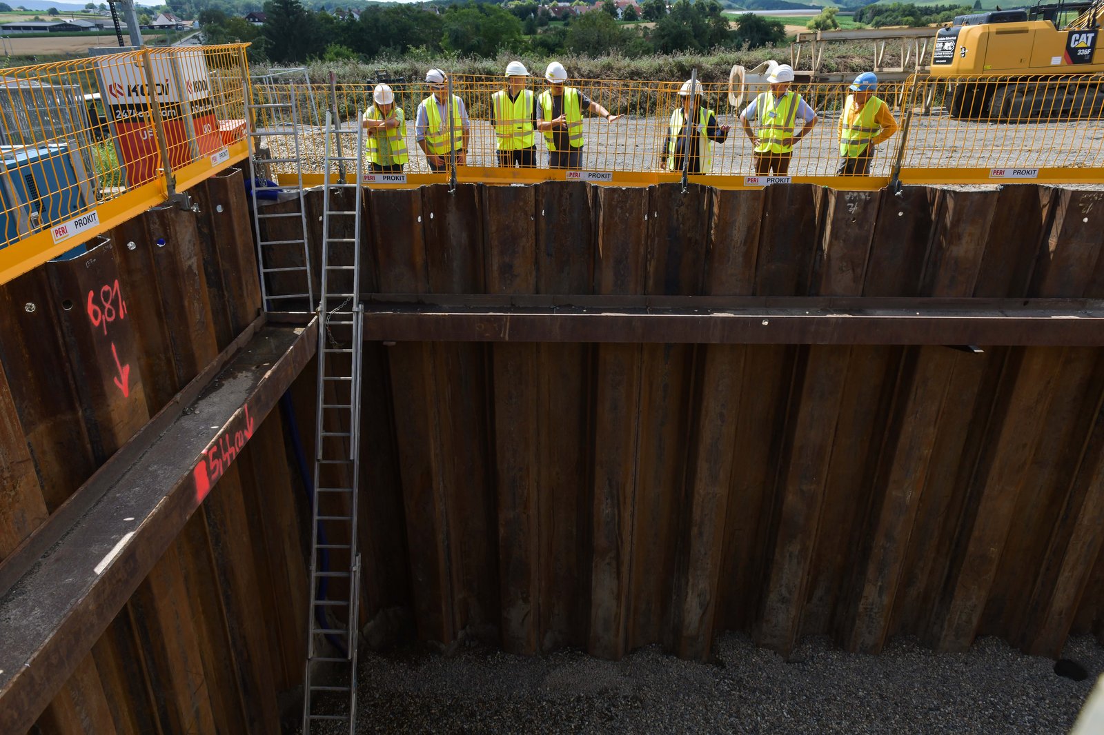 Wenn beim Bau der SEL Straßen, Flüsse oder Bahngleise auf der festgelegten Route liegen, werden diese meistens mittels Tunnelbohrungen unterirdisch gequert. Wie dieses Bauverfahren im Detail funktioniert, erfuhr die Besuchergruppe auf ihrem nächsten Stopp in Nordheim mit einem Blick in die dafür angelegte Baugrube.
